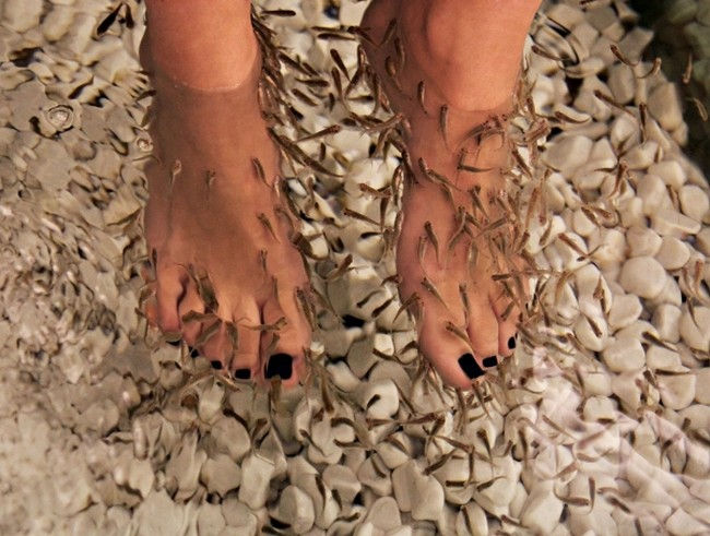 É um tipo de pedicure diferente: você mergulha os pés em uma bacia com peixes que comem toda a pele morta da região e também ela já passou um creme à base de caviar para combater as estrias que podem aparecer depois da gravidez. O segredo é que esse tratamento é feito com as ovas do esturjão Baerli, um peixe rico em um óleo hidratante da pele. E custa os olhos da cara sério, o preço de cada sessão do tratamento é quase US$ 400 (cerca de R$ 800).